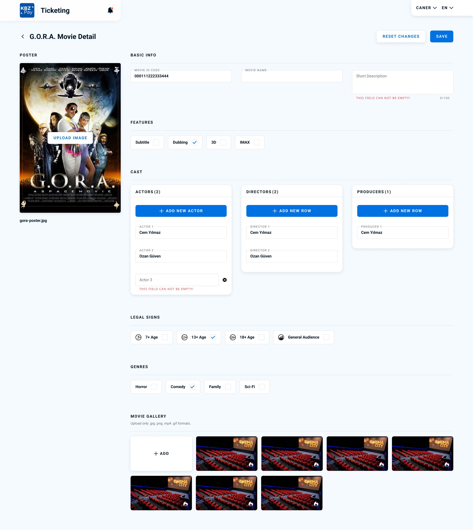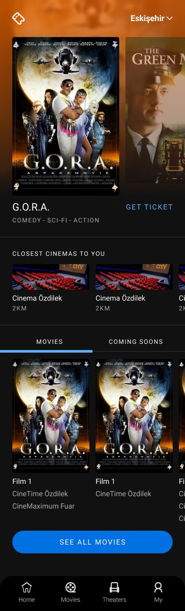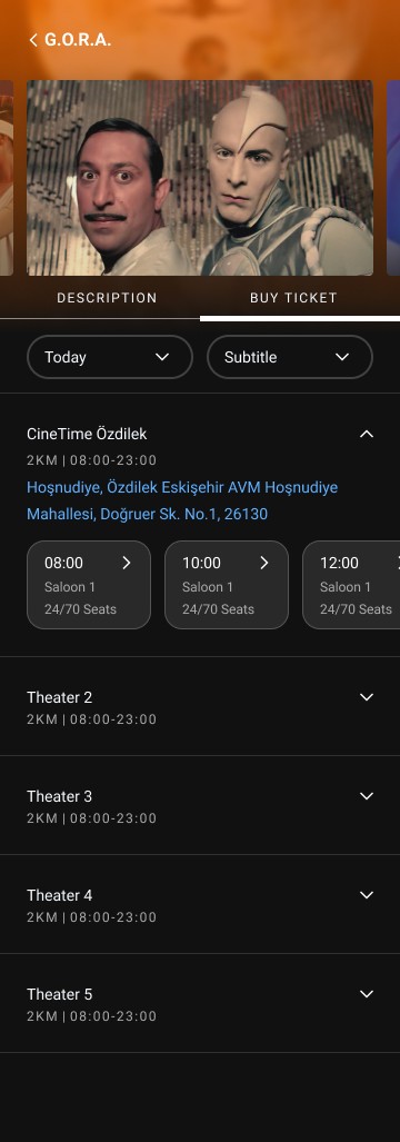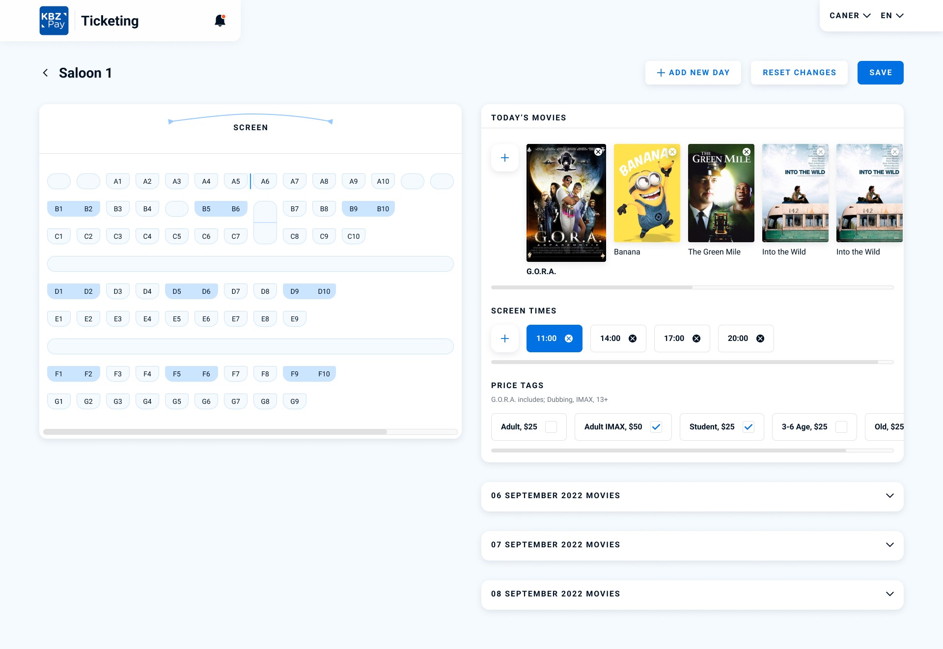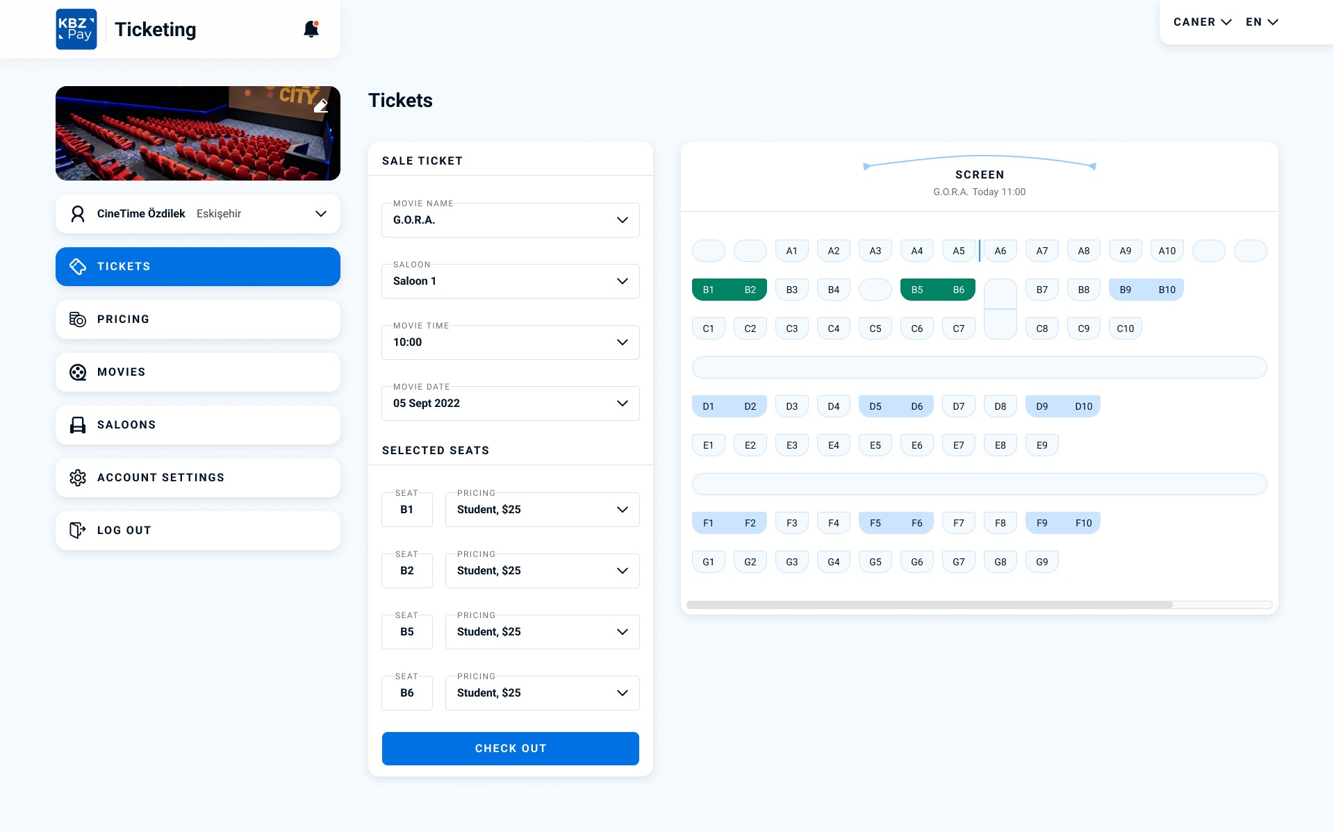 Saloon Detail page shows us the design of the saloon and movies that will be shown and planning the coming soon movies. We can define the show time of the film and select the price tags. We can add a new movie from the movie list and define its screening date and time quickly. Also, with this page, cinema owners can plan the next day’s movies.