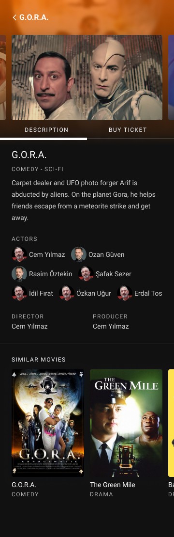 Movie Detail page includes all the data about the movie. So the user can see genres, legal signs, actors, and more in the app while choosing a movie that they want to watch.
