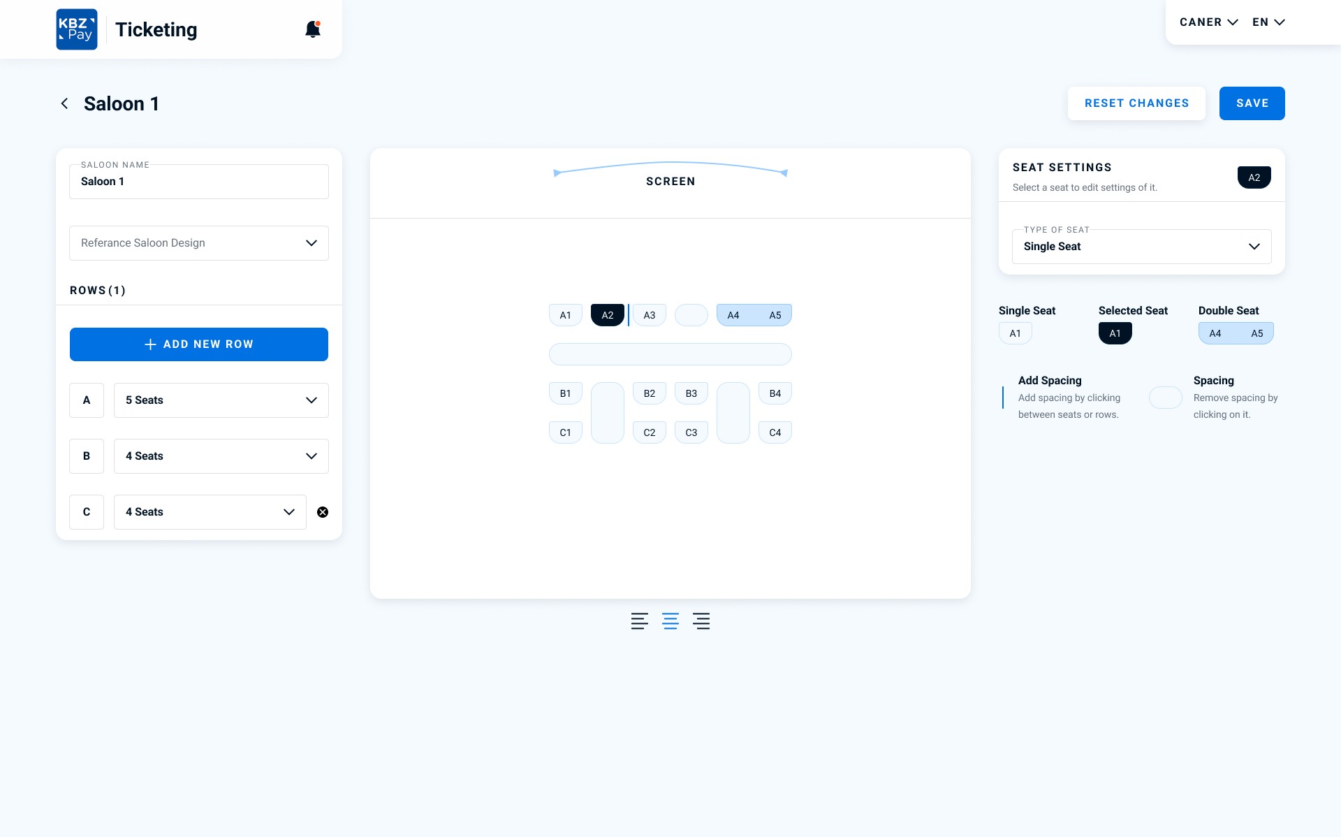 On this screen, an editor can design saloons. I’ve designed a simple guideline for it at the right of the screen. So editors can quickly create double seats or add spacing between rows or columns